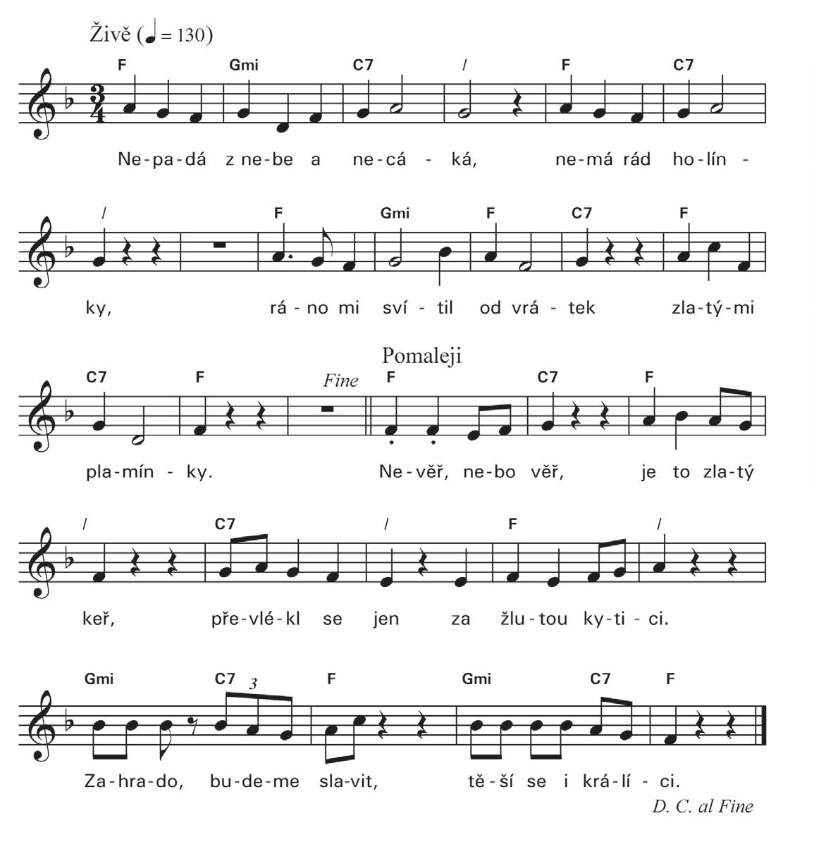 Nepadá z nebe a necáká, nemá rád holínky, ráno mi svítil od vrátek zlat˘mi plamínky.