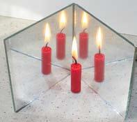 10. Slepte dv rovinná zrcátka k sob tak, aby bylo možné m nit úhel, který spolu svírají. Postavte je na podložku (obr. 25) a mezi n vložte n jaký p edm t (nap . sví ku nebo ví ko od xu). M te úhel, který spolu zrcadla svírají, a sledujte, kolik vidíte obraz sví ky.