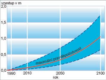 Předpokládaný vzestup hladiny světového oceánu v 21. století podle optimistických a pesimistických předpovědí.