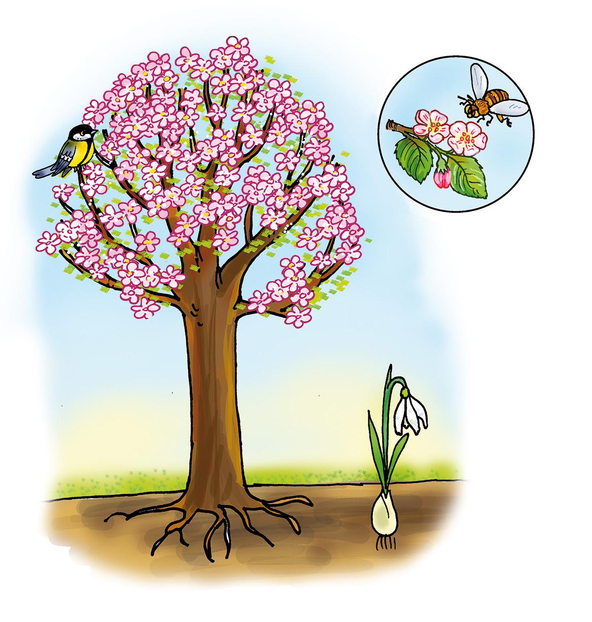 1. Pozoruj obrázek a odpovídej na otázky : a) Která roční období obrázky znázorňují ? Podle čeho to poznáš ? Spoj čarou obrázek se správným názvem ročního období. b) Jak se během roku mění jabloň? Jmenuj všechny pochody, kterými prochází. c) Jak se během roku mění sněženka ? Jak přezimuje? d) Co dělá na květu včela ? K čemu je prospěšná ? e) Co dělá sýkorka ? Jaký význam mají pro ovocné stromy ptáci ?