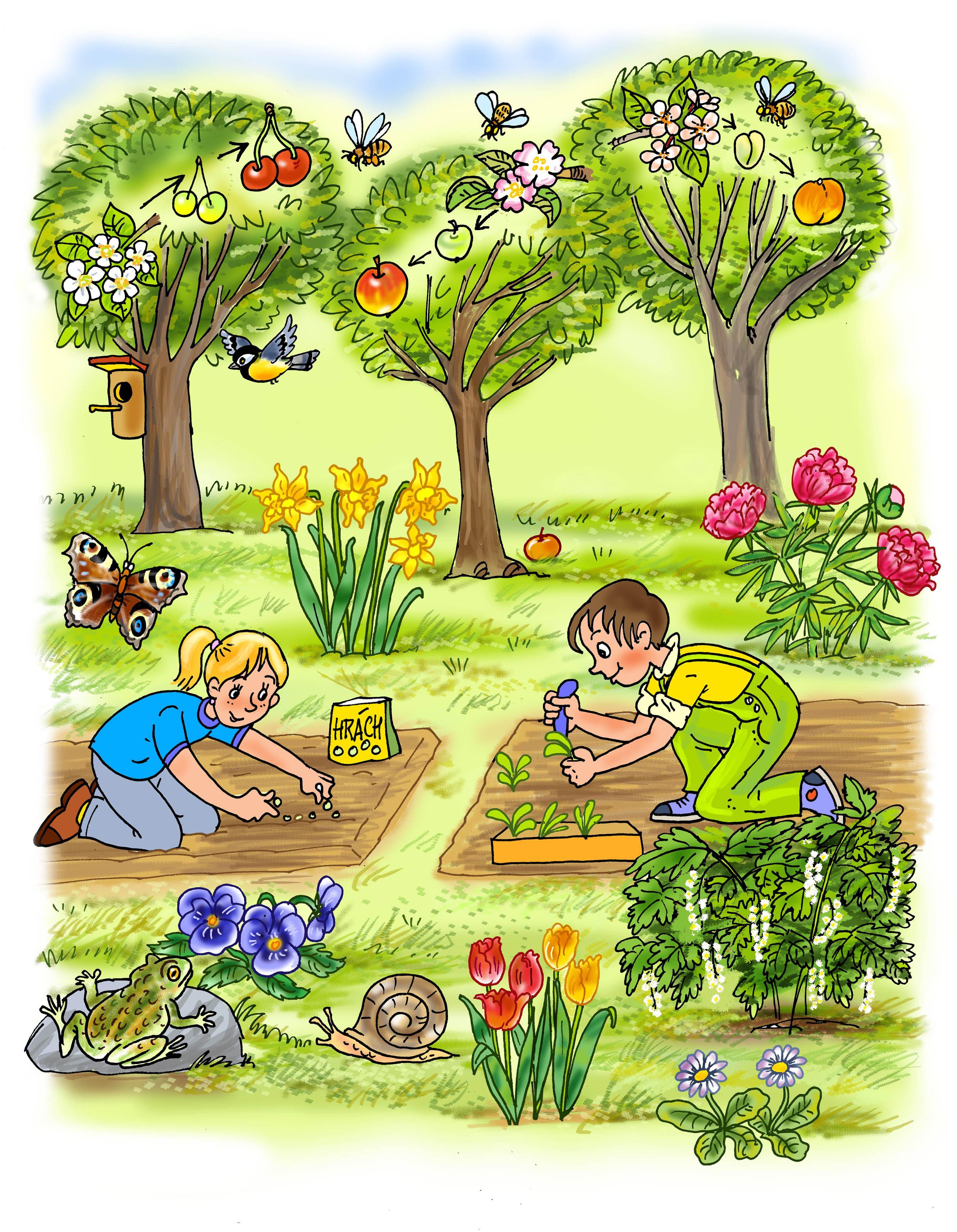 c) Urči, kdo na obrázku seje a kdo sází, a vysvětli, jaký je v tom rozdíl. d) Vyprávěj, co právě kvete na vaší zahrádce nebo v jiných zahradách při cestě do školy.