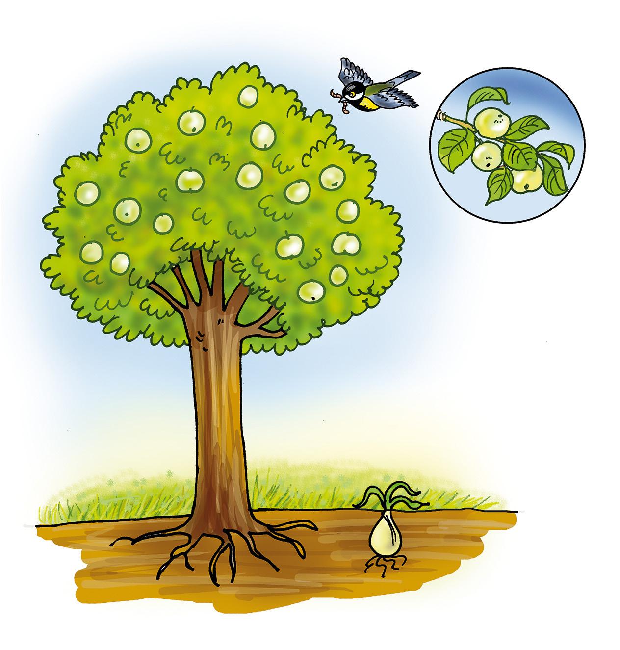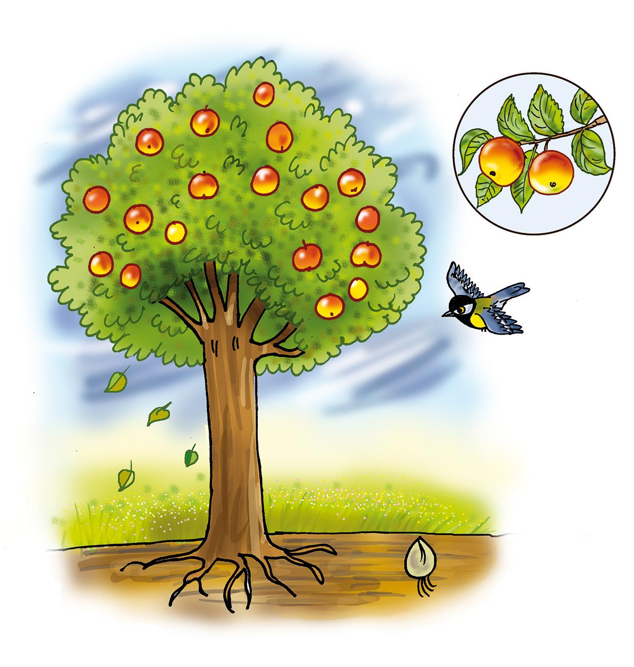 1. Pracuj s obrázkem : a) Vyprávěj, co vidíš na obrázku – pojmenuj stromy, keře a jejich plody, květiny a živočichy. b) Vyučující ti vysvětlí na obrázku naznačený proces vzniku plodu na stromě, tj. od květu (na jaře) a jeho opylení včelami až po vznik nezralého plodu a jeho zrání (v létě, nebo až do podzimu).