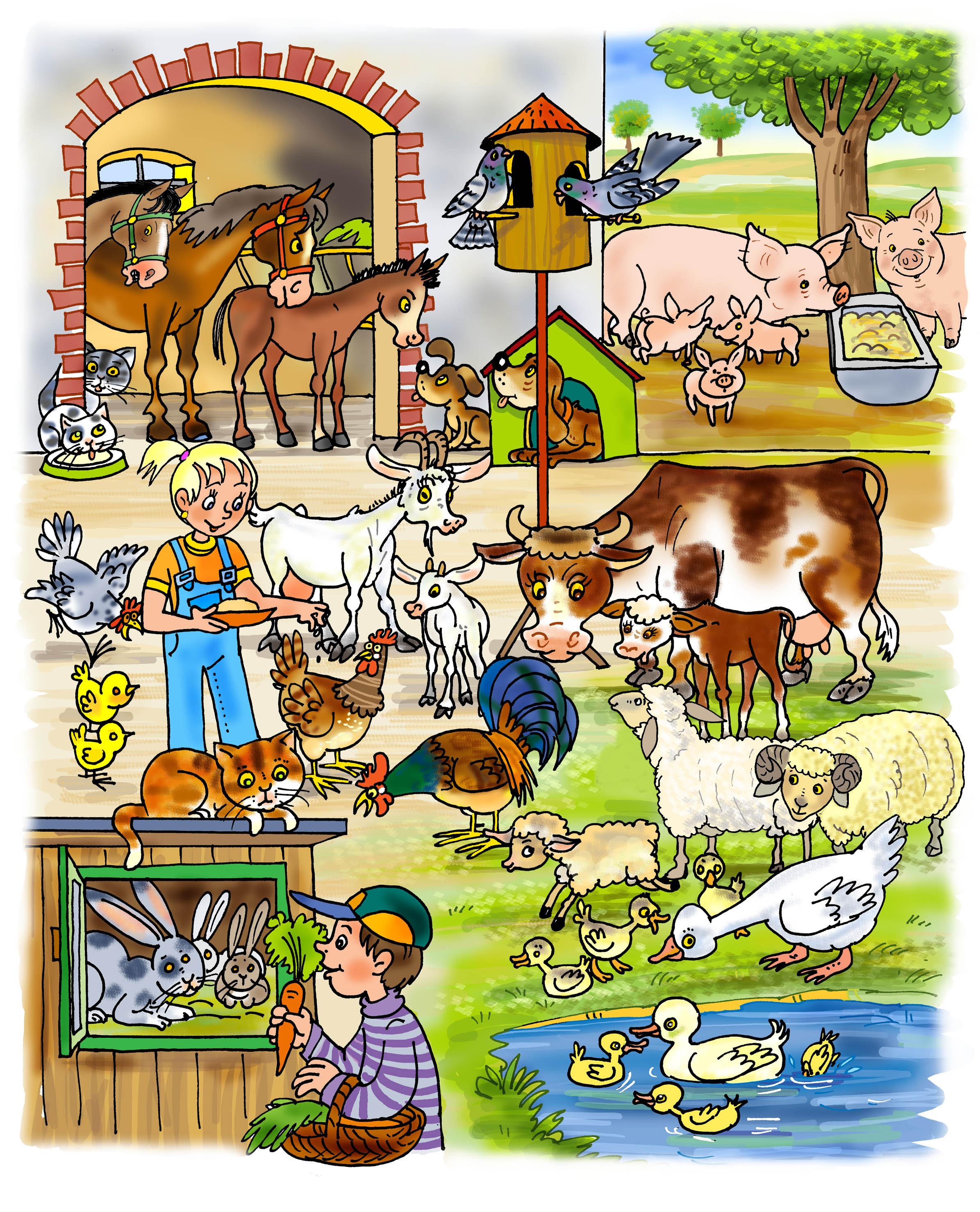 1. Pozoruj obrázek, plň úkoly a odpovídej na otázky : a) Pojmenuj zvířata i jejich mláďata. Čím se živí ? b) Která ze zvířat jsou dvounohá a která čtyřnohá? c) Jaký je rozdíl mezi zvířaty domácími a volně žijícími v přírodě? d) Znáš nějakou pohádku nebo příběh o zvířatech? Vyprávěj ho. e) Znáš písničku (nebo básničku) o domácích zvířatech? Zazpívej si ji se spolužáky.