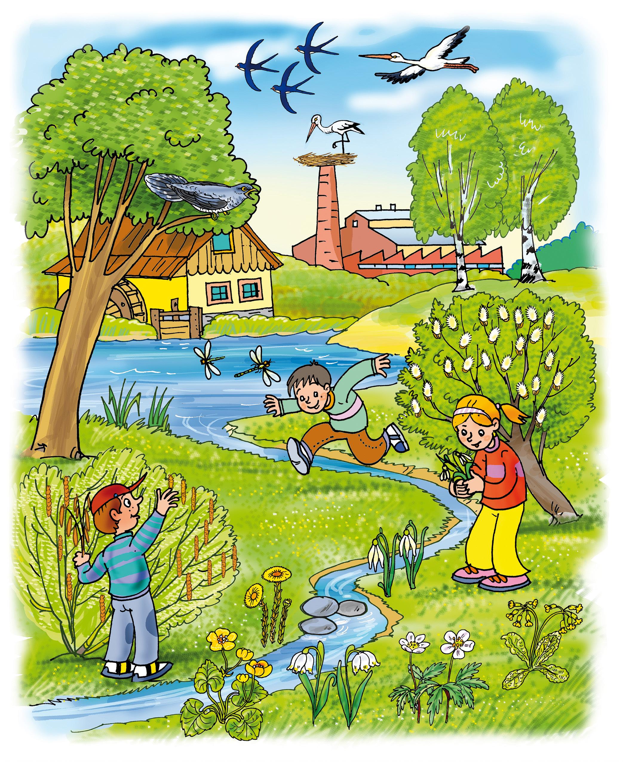 1. Pozoruj obrázek : a) popiš, co je v přírodě pro jaro typické (rozkvetlé rostliny, návrat vlaštovek a čápů z teplých krajin apod.) ; b) řekni názvy jarních květin a rostlin na obrázku a dalších, které jsi již viděl/a v přírodě; c) vysvětli, jak se musíme chovat v přírodě, abychom ji neničili, ale chránili.