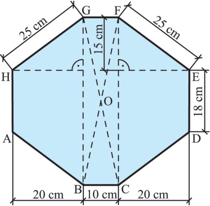 9. Geometrický útvar na obrázku je středově souměrný podle průsečíku O úhlopříček BF a CG. Je možné ho rozdělit na obdélník BCFG a dva shodné rovnoramenné lichoběžníky BGHA a FCDE. Vypočítejte: a) obvod, b) obsah tohoto útvaru