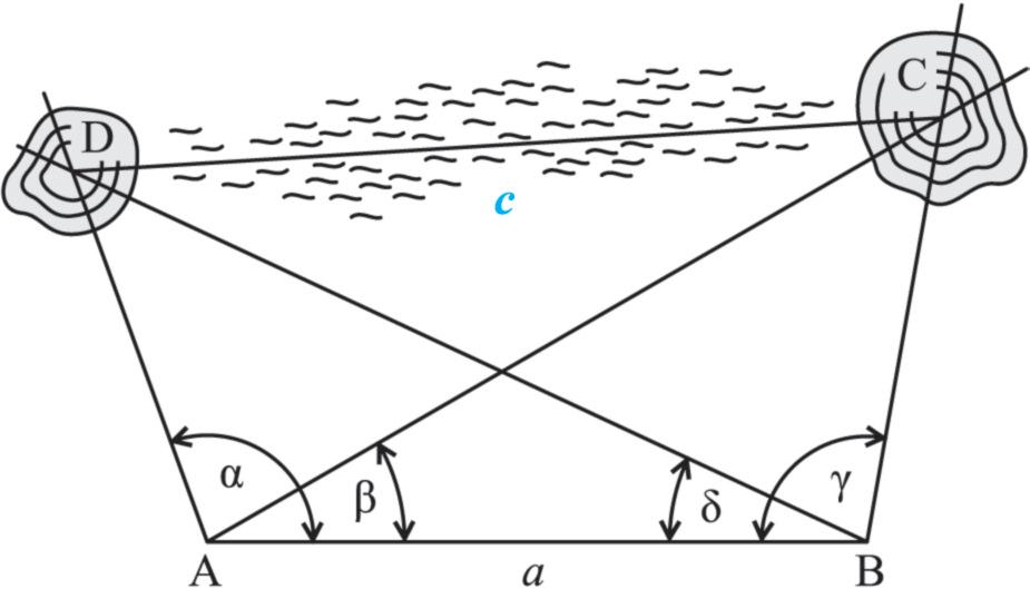 6. Zeměměřiči měli za úkol zjistit a zakreslit do plánu daného území s měřítkem 1 : 3 000 vzdálenost c vrcholků C, D dvou kopců, mezi nimiž byl nepřístupný močálovitý terén porostlý rákosem. K tomuto účelu si zjistili potřebné údaje, které si zakreslili do následujícího plánku. (Vzdálenost a terénních bodů A, B byla přístupná měření pomocí měřičského pásma, velikosti úhlů α, β, γ, δ určili zeměměřiči pomocí přístroje zvaného teodolit )