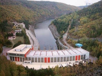 Přehrada Dalešice, v pozadí chladicí věže jaderné elektrárny Dukovany