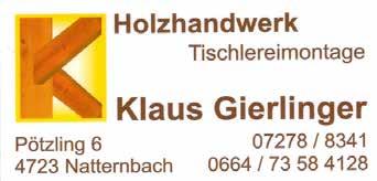 dan K esch Ö n! Ob schon seit 130 Jahren wie der Musikverein oder frisch gegründet wie die Kinderfreunde – natternbach lebt von seinen Vereinen. Ohne feuerwehr, die diversen Sportvereine, gesunde gemeinde, Spiegelgruppe und all den anderen würde der Alltag nicht funktionieren. Es freut uns, wenn wir hier ein wenig helfen können, ob durch die Spende eines Matchballs, einen Beitrag zum löschzug, die unterstützung des Jungscharlagers oder ein Dankeschön an die fahrerinnen von Essen auf Rädern... wir wollen auch in zukunft die vielen initiativen so gut es geht unterstützen.