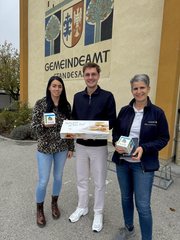 Am 11. November, dem traditionellen Faschingsbeginn, besuchte uns DI Ute Pretl-König von Krückl Bau am Gemeindeamt. Für die Mitarbeiterinnen und Mitarbeiter gab es Krapfen, eine freundliche Geste, über die wir uns sehr gefreut haben. Am Foto: Stefanie Brandl, Bürgermeister Alexander Leutgeb und DI Ute PretlKönig.