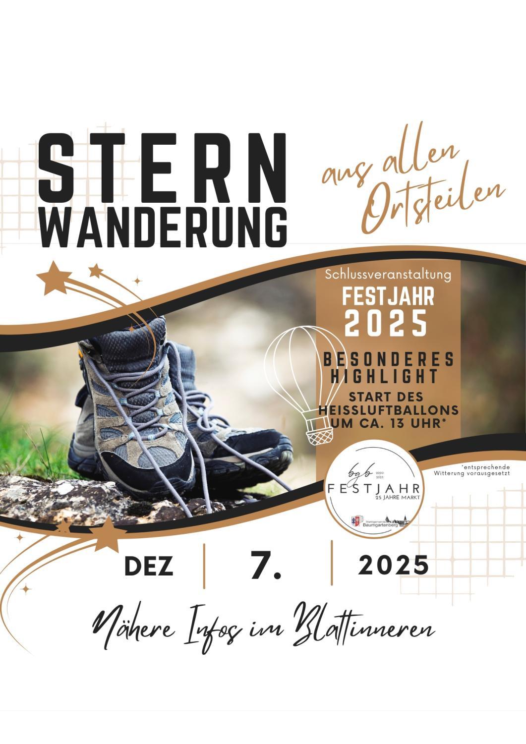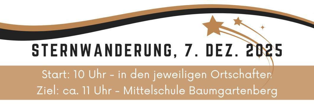 Zum Abschluss unseres Festjahres darf ich alle Baumgartenbergerinnen und Baumgartenberger sehr herzlich zum Sternmarsch am Sonntag dem 7. Dezember einladen. Nach der Wanderung findet in der Aula der Mittelschule ein gemütlicher Frühschoppen statt. Der Festausschuss freut sich über eine rege Teilnahme für einen gemeinsamen Abschluss unseres Jubiläumsjahres.