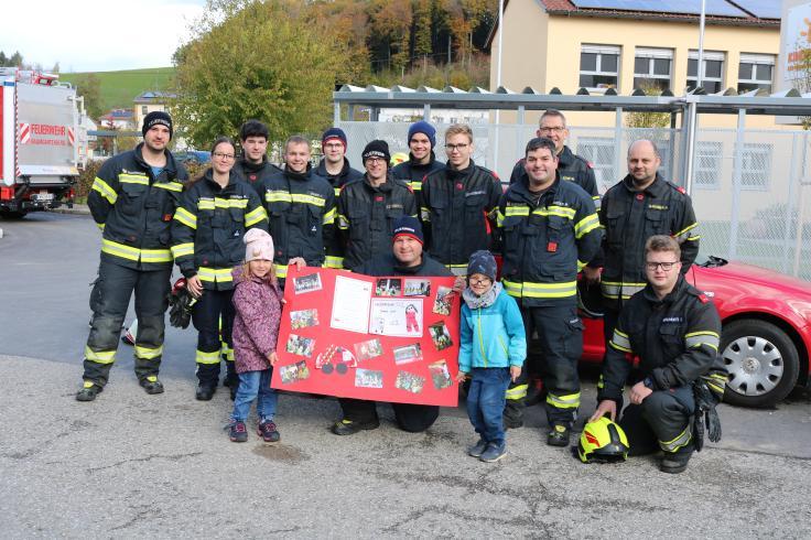 Wir überraschten die Feuerwehrleute mit einem Rollenspiel passend zum Feuerwehrlied und einem Plakat für den Mannschaftsraum der Feuerwehr. Im Gegenzug erhielten die Kinder ein Mal- und Lesebuch des OÖ. Landesfeuerwehrverbandes.