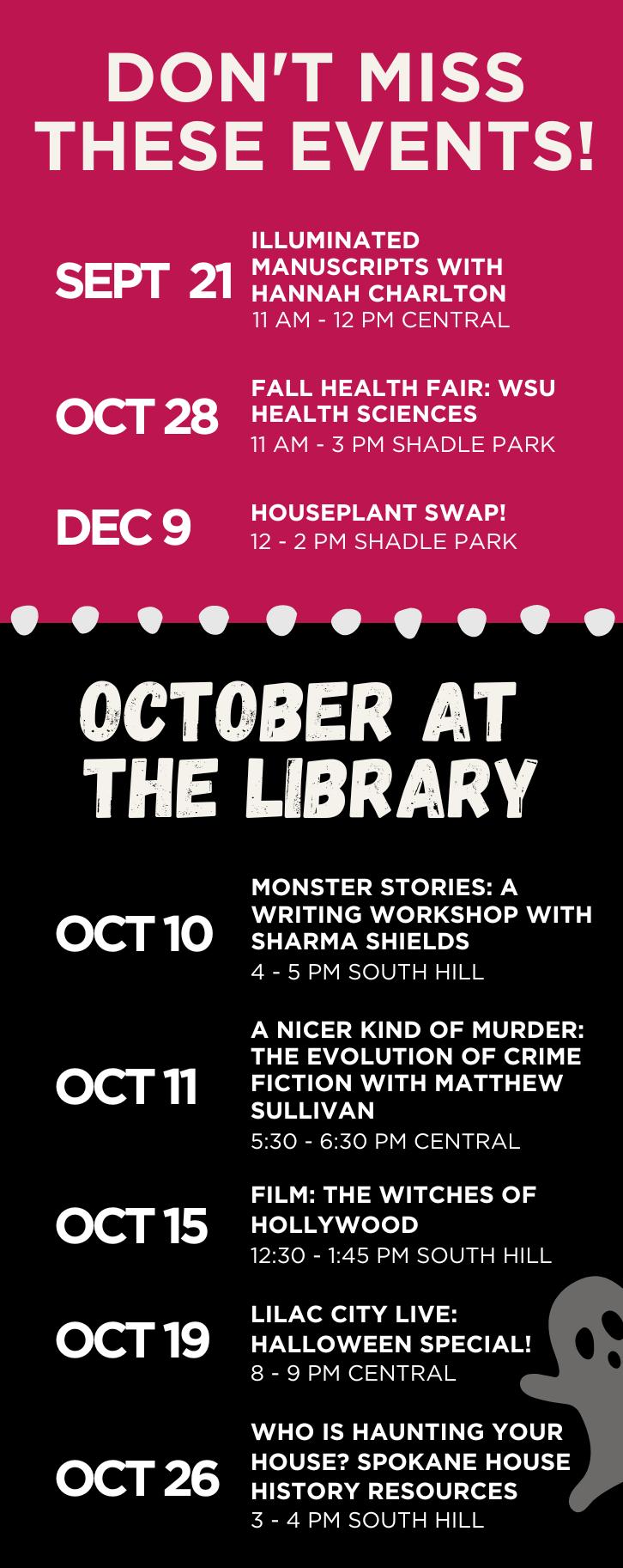 The Spokane Writers Conference is an annual two-day event organized by Spokane County Library District and Spokane Public Library. All workshops are free and open to writers at all stages of their writing careers. Topics include self-editing, picture book queries, fact-finding for historical fiction, and much more. October 27 events will take place at Central Library. October 28 events will be at the Valley Library. Learn more at events.spokanelibrary.org.