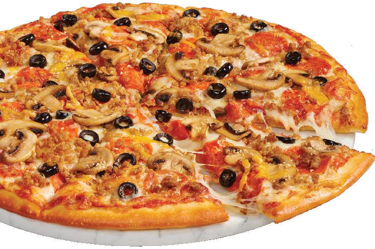 Pepperoni, Sausage, Mushrooms, Black Olives, Herb & Cheese Blend, Mozzarella, Red Sauce in Large or Family Size