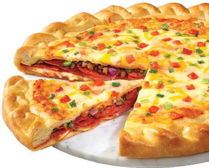 Two layers of Original Crust stuffed with Red Sauce, Pepperoni, Sausage, Mushrooms, Black Olives, Mozzarella, topped with Red Sauce, Tomatoes, Green Peppers, Herb & Cheese Blend