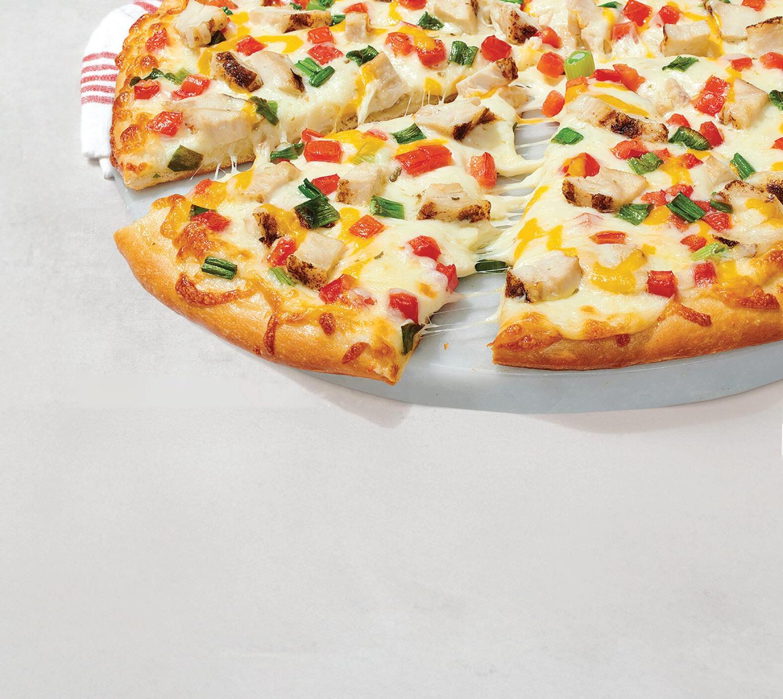 Two layers of Original Crust stuffed with Creamy Garlic Sauce, Chicken, Bacon, Tomatoes, Mixed Onions, Mozzarella, topped with Creamy Garlic Sauce, Tomatoes, Bacon