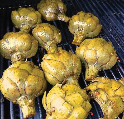 Barbecue: Cut and trim several mediumsized artichokes, then cut in half lengthwise down through the stem. This will expose the choke or furry part. With a paring knife, dig out the choke. Put them in a steamer and cook until the bases are fork-tender, about 25 minutes; add more water as needed. Cool. Marinate with equal parts olive oil, balsamic vinegar, and soy sauce -- about 1/3 cup of each for four artichokes. (Add grated fresh garlic, salt and pepper, if you wish.) Refrigerate at least 2 hours.