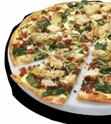 Chicken, Bacon, Artichoke Hearts, Spinach, Parmesan, Zesty Herbs, Mozzarella, Creamy Garlic Sauce on Thin Crust