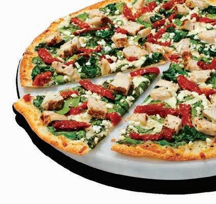 Chicken, Spinach, Sun-dried Tomatoes, Feta, Zesty Herbs, Mozzarella, Olive Oil, Garlic on Thin Crust