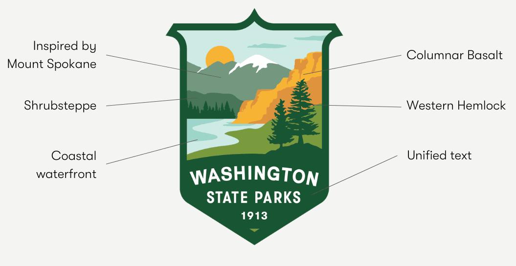 The new logo shows evolving landforms and a more diverse color palette, meant to represent Washington as a whole, from the summit of Mount Spokane and the columnar basalt in the east to the shrubsteppe of the midlands and the coasts in the west.