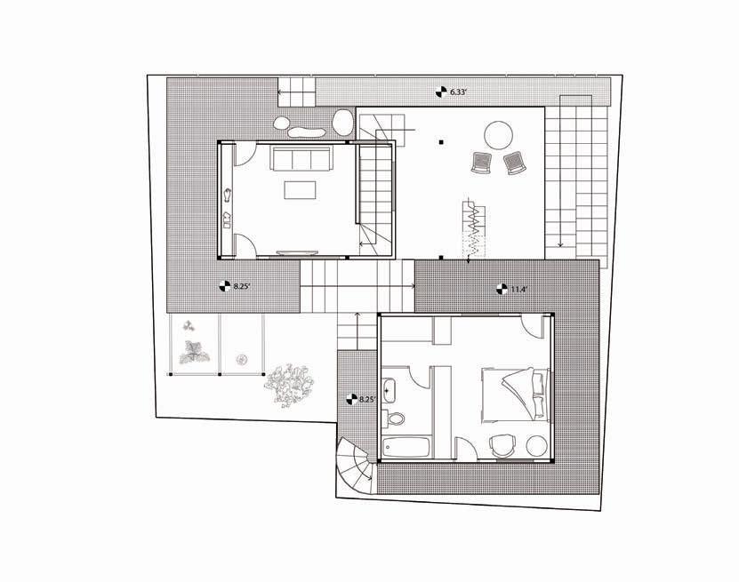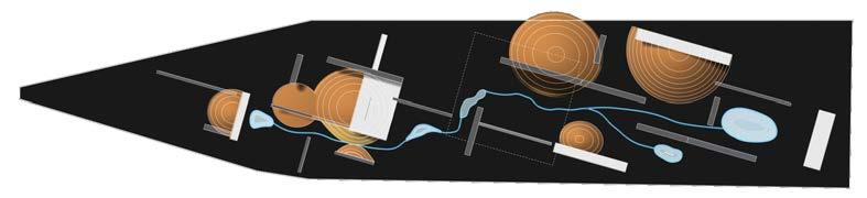 Following Semper’s idea of having an interior masked by a simple form, our concept begins with an intricate space that takes place within a typical Mykonos building. e complexity of the interior is concealed by the vernacular qualities of the exterior. Like Semper, we found that an abundance of rich materiality and shapes can drive the overall experience of the space and provide greater contrast with the exterior. In terms of the exterior scheme, typically buildings in Mykonos are terraced o of one another, built in to a hillside, and open up to a view. All of these elements combined create a ow of units that mesh together.