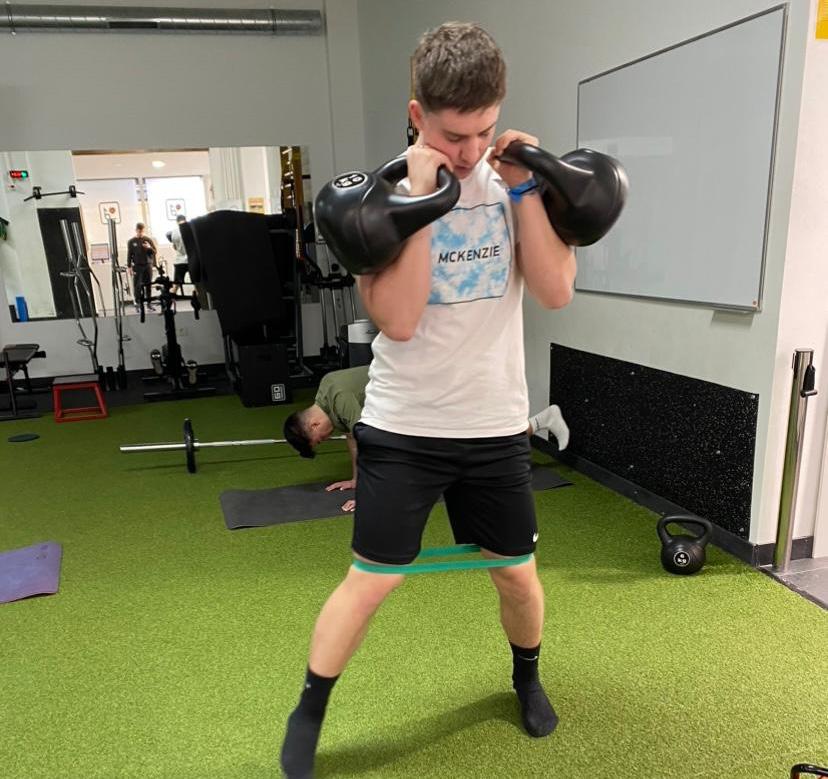 Durante este proceso en el que comenzamos a trabajar de forma monopodal, el paciente comienza a remitir molestias en la zona externa de la rodilla al realizar ejercicios en los que la rodilla pasa demasiado por delante de la puntera en situación de carga. Estas molestias también aparecen en su vida diaria si camina mucho. Llegados a este punto, volvemos a realizar una valoración muscular del paciente detectando un exceso de tono en el músculo “tensor de la fascia lata” que puede estar provocando estas molestias. Ante esto intervenimos con terapia manual por parte de los fisioterapeutas quitando tensión a la musculatura implicada y trabajando la musculatura del glúteo medio que se encuentra hipotónica.