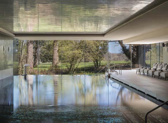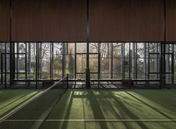L’edificio è stato realizzato con legno, vetro e pietra calcarea, scelti per assicurare l’integrazione nel contesto, senza soluzione di continuità. Le grandi vetrate creano una perfetta sinergia tra interno ed esterno, permettendo un’ampia visuale sul paesaggio e l’ambiente stesso, con i suoi ritmi, ha determinato l’orientamento e la posizione dell’edificio e la sua forma. La massa dell'edificio è divisa in tre volumi: il principale, rivestito in legno di larice, ospita la reception principale, uno spazio di simulazione del golf, due campi da padel, una palestra e uno studio di yoga/pilates. Il volume è orientato in direzione est/ovest per sfruttare il sole. I campi da padel si aprono a est. La palestra e lo studio sono situati al primo piano e incorporano vetrate dal pavimento al soffitto: si ha l’impressione di allenarsi tra gli alberi. Le attività acquatiche occupano il secondo volume, parallelo ai campi da padel: piscina, idromassaggio, sauna, bagno turco e zone relax. L'involucro dell'edificio si apre a nord per approfittare della bellezza naturale del parco, con viste sul paesaggio, sul vicino castello e sul convento agostiniano. L'apertura della piscina a nord migliora la qualità dello spazio interno riempiendolo con una luce naturale diffusa, impedendone al tempo stesso il surriscaldamento. Un volume più basso di collegamento ospita gli spazi condivisi: spogliatoi, docce e spazi di servizio.