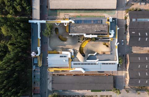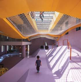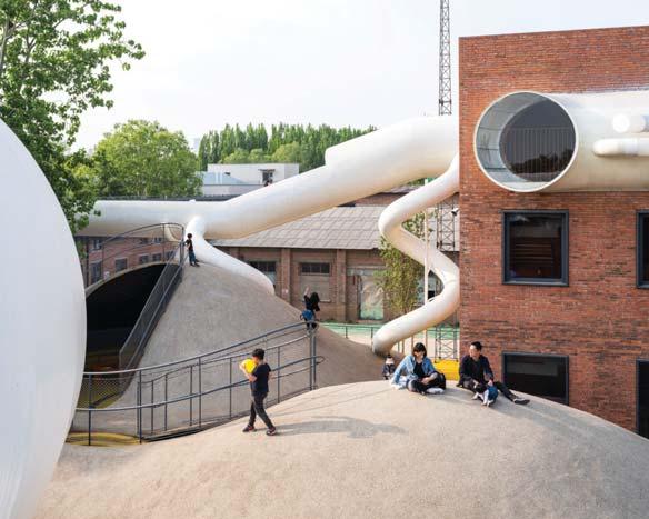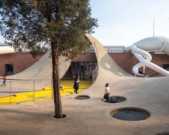Le collinette migliorano la propriocezione e l’equilibrio, lasciando libertà di decisione: permettono ai bambini di esplorare e decidere quale direzione prendere, quale inclinazione e a quale velocità, in tutta sicurezza. Si accede a un’ulteriore area gioco coperta tramite scivoli e fessure dal livello terrazza. Il playground è fondato su un insieme di magazzini che circondano un cortile; una strada disconnette l’edificio più a sud, che viene riunito nuovamente da un ponte aereo che collega le terrazze sul tetto. L’accesso fornisce un percorso privato a un asilo adiacente e l’ingresso in un parco pubblico. Diversi gli spazi gioco presenti: uno è per bambini di 2-4 anni, con topografia morbida, un secondo è diviso verticalmente in tre livelli, con una zona per bambini sopra i 4 anni che include un ambiente interattivo sotterraneo, arrampicata e scivoli. Al livello 2 e 3 si trovano 6 aule multifunzione. Tutti gli edifici hanno una terrazza sul tetto ad anello che facilita l’osservazione dei bambini da parte dei parenti. Dove l’iconografia del progetto diventa attività, abbracciando un certo grado di rischio, la speranza è di spingere i bambini a immaginare e sentire ciò che vedono come i limiti della loro stessa avventura.