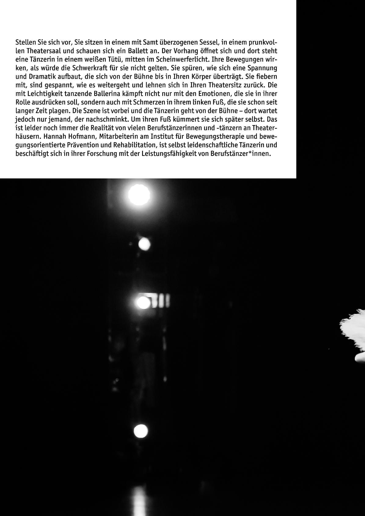 Gibt es schon Forschung oder tappt man da noch ganz im Dunkeln? Das ist ja das Spannende, denn das tut man ganz und gar nicht. Es gibt Forschung zu beispielsweise psy chologischen, trainingswissen schaftlichen oder auch vielen me dizinischen Themen. Spannend finde ich die Arbeiten zum Umgang mit Schmerzen, welche sich auch mit meinen Ergebnissen bisher ge deckt haben. Tänzer*innen haben eine erhöhte Schmerztoleranz und sehen Schmerzen teils sogar als positiv an und als Ergebnis oder Bestätigung ihres harten Trai nings. In der Literatur hat Wulff das schon früh culture of injury and pain (1998) genannt, oder auch