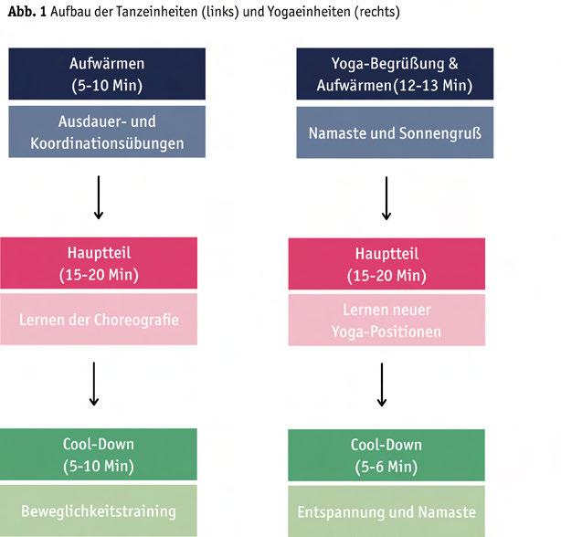 Beim Tanzen bestanden die Stunden aus einem Aufwärmen mit allgemeinen und tanzspezifischen Ausdauer- und Koordinationsübungen (5-10 Minu ten), einem Hauptteil, in dem die Choreographie gelernt wurde (15-20 Minuten), und einem abschlie ßenden Beweglichkeitstraining für den Unter- und Oberkörper als Cool-Down (5-10 Minuten) (s. Abb. 1). Pro Einheit wurden ca. 20 Sekunden der schließlich dreiminütigen Choreo vermittelt. Zur Vorbereitung