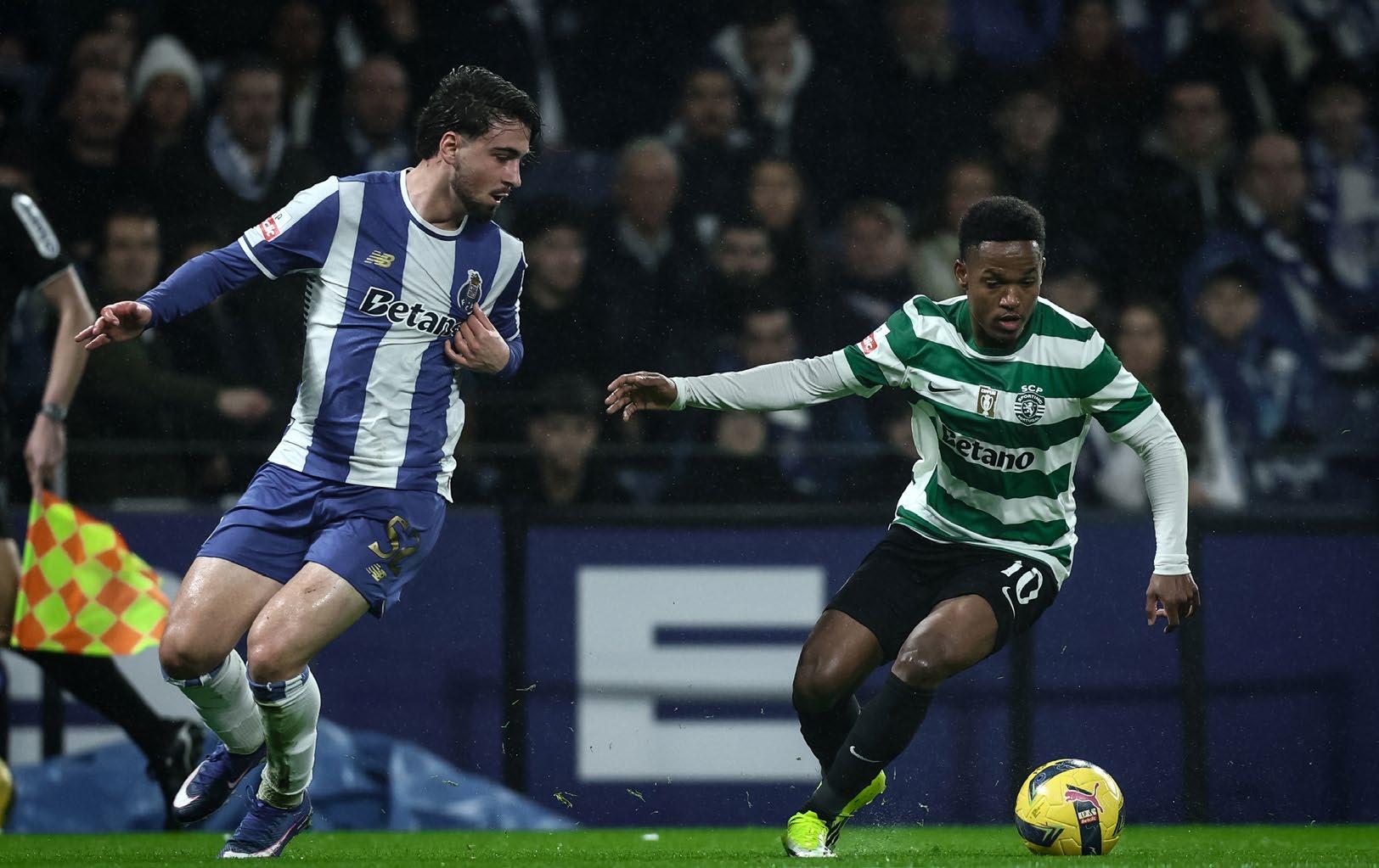 em Ousmane Diomande antes de sair pela linha final. Depois de mais alguns pontapés de canto do mesmo lado, foi em jogo corrido que chegou nova ameaça e dos pés de Iván Fresneda, que trabalhou muito bem e rematou, mas a bola amorteceu num defesa e Diogo Costa defendeu facilmente. Aos poucos, contudo, o jogo foi perdendo cada vez mais intensidade e velocidade. O Sporting CP parecia estar a controlar, mesmo sem criar perigo no último terço, contra um FC Porto mais satisfeito com o empate, mas, os 77’, chegou a surpresa. Numa das primeiras vezes que os azuis e brancos conseguiram ter bola na área dos Bicampeões