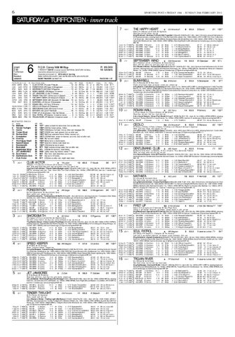 CLUB VICTOR (TA Lowe) F Naude .......................... 12 FORESTATION (RR Sage) G Wrogemann ............... 10 SWORDSMITH (BO Wiid) G Figueroa ...................... 13 SPEED KEEPER (RR Magner) G Lerena ................. 7 JET JAMBOREE (D Zaki) F Coetzee ......................... 9 TENDER TWILIGHT (OA Ferraris) A Delpech .......... 11 THE HAPPY HEART (GV Woodruff) D David ............. 8 SEPTEMBER WIND (GM Alexander) M Odendaal .. 15 BUNNYBELL (B Warren) S Swanepoel ..................... 2 ROMAN WALL (SG Tarry) R Simons ....................... 14 CECILO (GV Woodruff) D Mansour .......................... 6 GENTLEMANS CLUB (MG Azzie) K Irmer ................ 4 MATHAFA (AG Laird) F Herholdt ............................. 16 FIRST UP (E Verdonese) J Van Der Merwe ............. 5 SOUL PATROL (RR Magner) X reserve runner ........ 3 TROJAN RIVER (PF Matchett) X reserve runner ..... 1