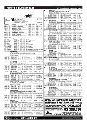 Winter Frost (V Rugg) S Brown.......................... 15 Victoria Park (LJ Human) J Sampson................. 14 Star Voyager (FC de Beer) M Mienie...................... 2 Wisper The Wind (HJN Kotze) T Pretorius............... 1 Sunley Simola (DA Sham) G Wrogemann............. 12 AMOROSO (C Spies) J Greyling................................. 4 Carousel (RR Magner) F Naude........................... 11 Sioux She (C Spies) S Chambers.......................... 16 Fleche D’or (V Rugg) F Herholdt............................. 7 Hail The Wind (JAJ Visser) M Yeni.......................... 9 Herecomesthebride (V Rugg) L Nhlapo................ 3 Theory (S von W Smit) A Aucharuz........................ 10 Snow Garland (JAJ Visser) S Khumalo................ 13 La Flamme (P Smith) R Simons............................... 8 Equivalence (JAJ Visser) - reserve 1...................... 5 Secret Spirit (JAJ Visser) - reserve 2..................... 6