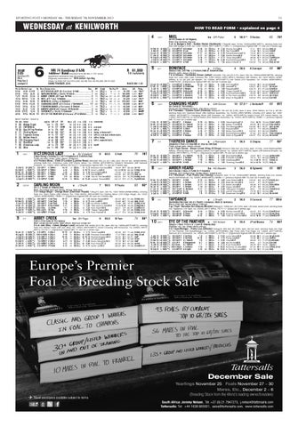Prof S A B De Curtis (B: TD Andrews) Black, orange crossed sashes, black sleeves, black cap, orange star 5 b m Jam Alley - Calais (Badger Land) 29Oct08; 30k vinthit (SI 0.78); dam: 33r-1w, 1400m(AR70-MR72), winning foals incl. Abbey Creek (08f Jam Alley; 4w, 1400m; AR74-MR77); Dover Crossing (06f Announce; 1w, 2000m; AR75MR71); 57/74/-/-/-; [D]previous highest MR: 77; last ran 2 weeks ago 10-13 63 54.0ba 1 2.75 *Kind Lady58.5 85.58 9/1 71 (ok) B;hndy;ro wl 16 Jul 13 L 1400 bg 61k MR75 K Steyn s 3-18 71 60.0ba 12 14.00 Princess Victoria60.0 77.37 110/1 48 (ok) hndy;dr out 10 Aug 13 K 1200 s 150k WFAfm K Steyn 16-16 77 60.0ba 16 18.70 Rushintothewind58.5 93.32 18/1 22 (F) midf 4 Sep 13 o K 1400 bh 61k MR77f K Steyn 2-14 77 60.5ba 5 3.10 Omaticaya55.0 90.03 18/1 72 (ok) nvrnrr 11 Sep 13 o K 1400 bs 61k MR76f K Steyn 4-11 76 52.0ba 7 6.40 Diva’s Daughter56.5 75.79 10/1 47 (ok) midf 23 Sep 13 L 1200 bs 75k MR92f K Steyn 5-12 74 57.0ba 12 8.80 Pure Power57.0 82.06 14/1 50 (ok) nvrinit 9 Oct 13 L 1300 bg 62k MR80f K Steyn 6-12 72 58.0ba 2 0.75 Surfer Girl56.5 86.02 29/1 74 (ok) D;midf;ro wl 23 Oct 13 L 1400 bg 61k MR76f R Fourie