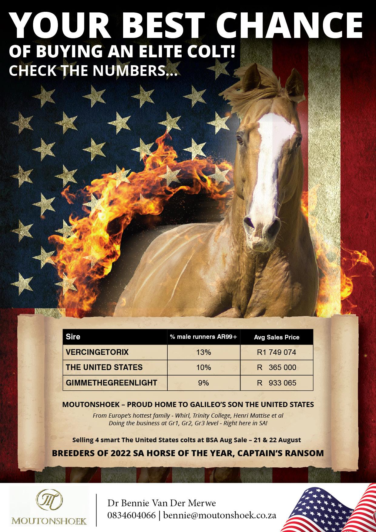 Moutonshoek, breeders of champion Captain’s Ransom and 2025 Gr1 TAB SA Classic winner Confederate among others, will be offering five smart colts at the upcoming August Two Year Old Sale.