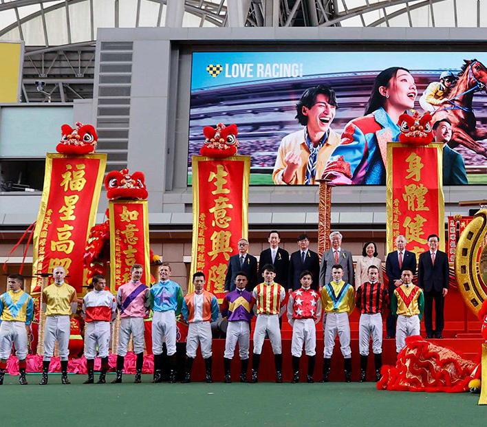 The jockeys pose with management for the season opening shot | Credit: HKJC