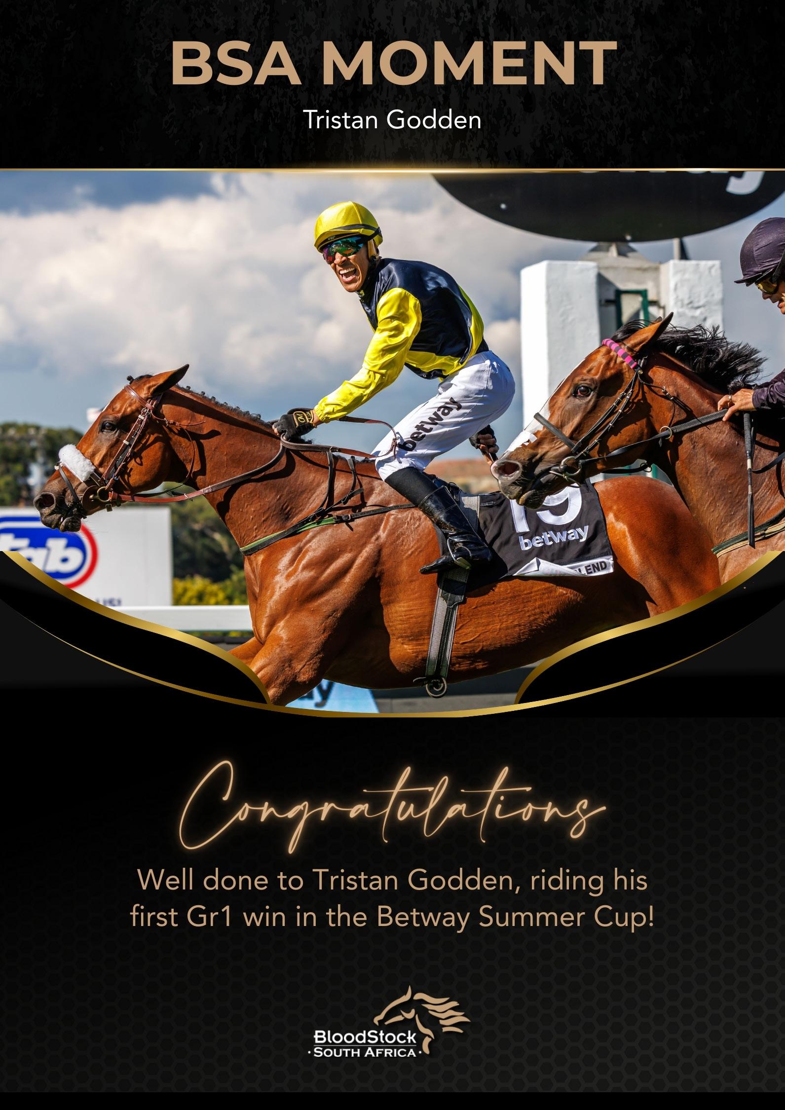 The stars aligned at Turffontein on Saturday for 29-year-old Tristan Godden when the KZNbased jockey achieved a milestone first Grade 1 winner, courtesy of the Frank Robinsontrained Mocha Blend, a 100-1 victress in the 2025 renewal of the Betway Summer Cup.