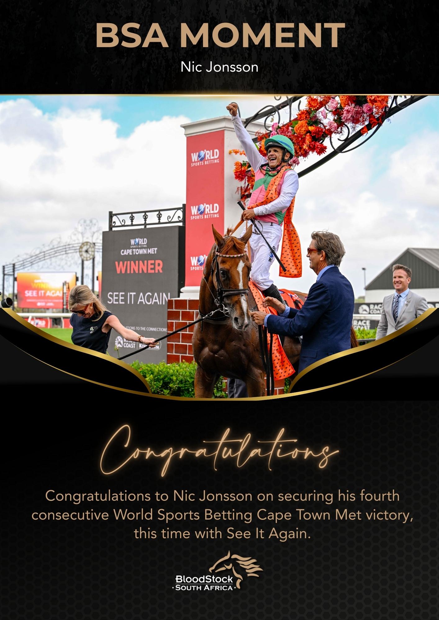 There is nothing more heart warming than to see a class horse come back successfully. The 2026 World Sports Betting Gr1 Cape Met provided us with one of those ‘feel-good’ moments in racing, as it was third time lucky for the winner See It Again, who continued the Snaith stable and owner Nic Jonsson’s stranglehold on the race as their fourth consecutive winner, whilst providing 58-year-old jockey Andrew Fortune with a maiden Met success.
