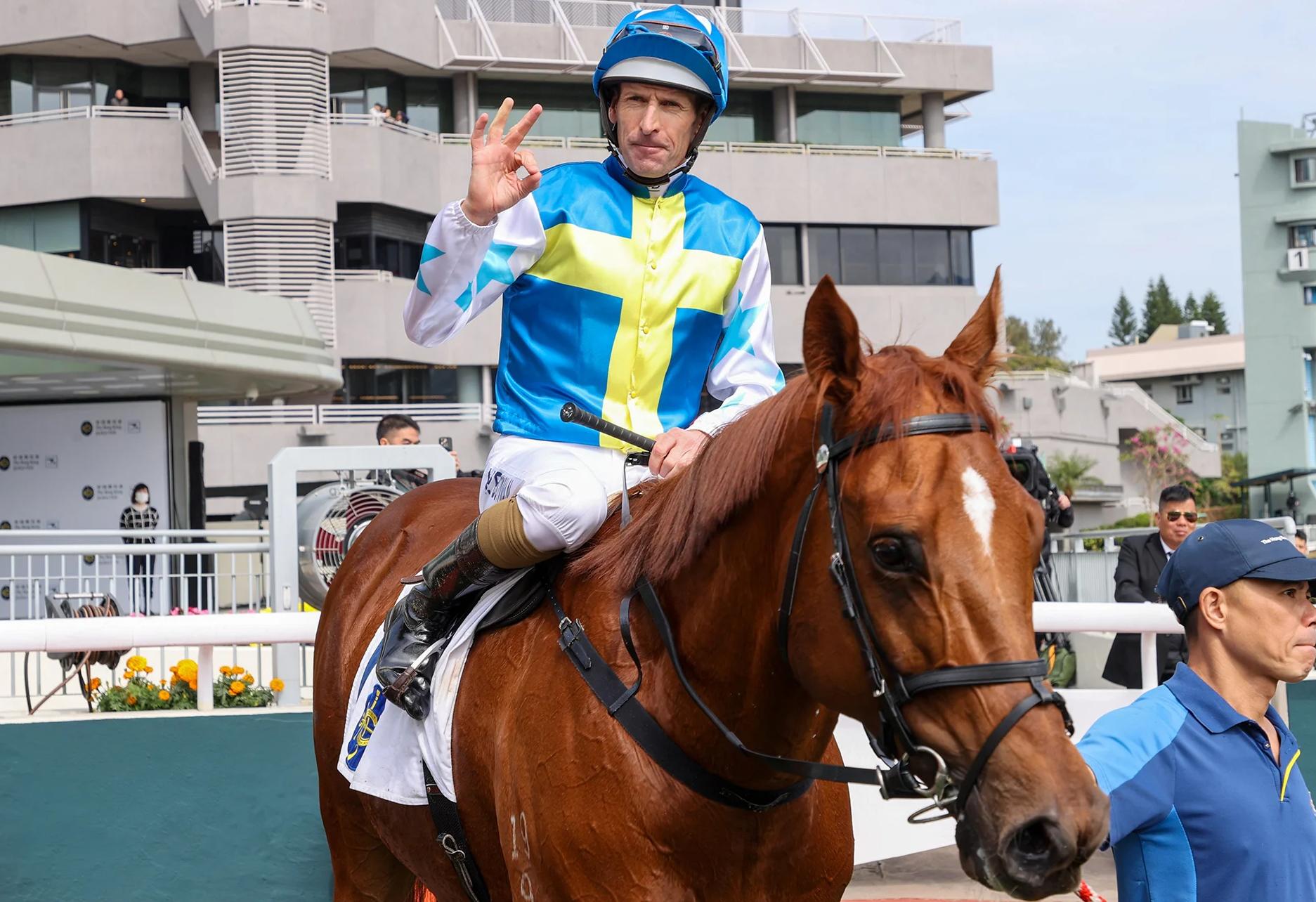 David Hall slotted a double with Shotgun (130lb) in the Class 5 Kiu Tsui Handicap under Matthew Poon and Rising Phoenix (131lb) for James Orman in the Class 4 Robin’s Nest Handicap, before Poon also sealed a brace when Michael Chang’s Glowing Praise (125lb) surprised at 31/1 and claimed a PP Bonus of HK$1.5 million with victory in the Class 3 Hoi Ha Handicap.