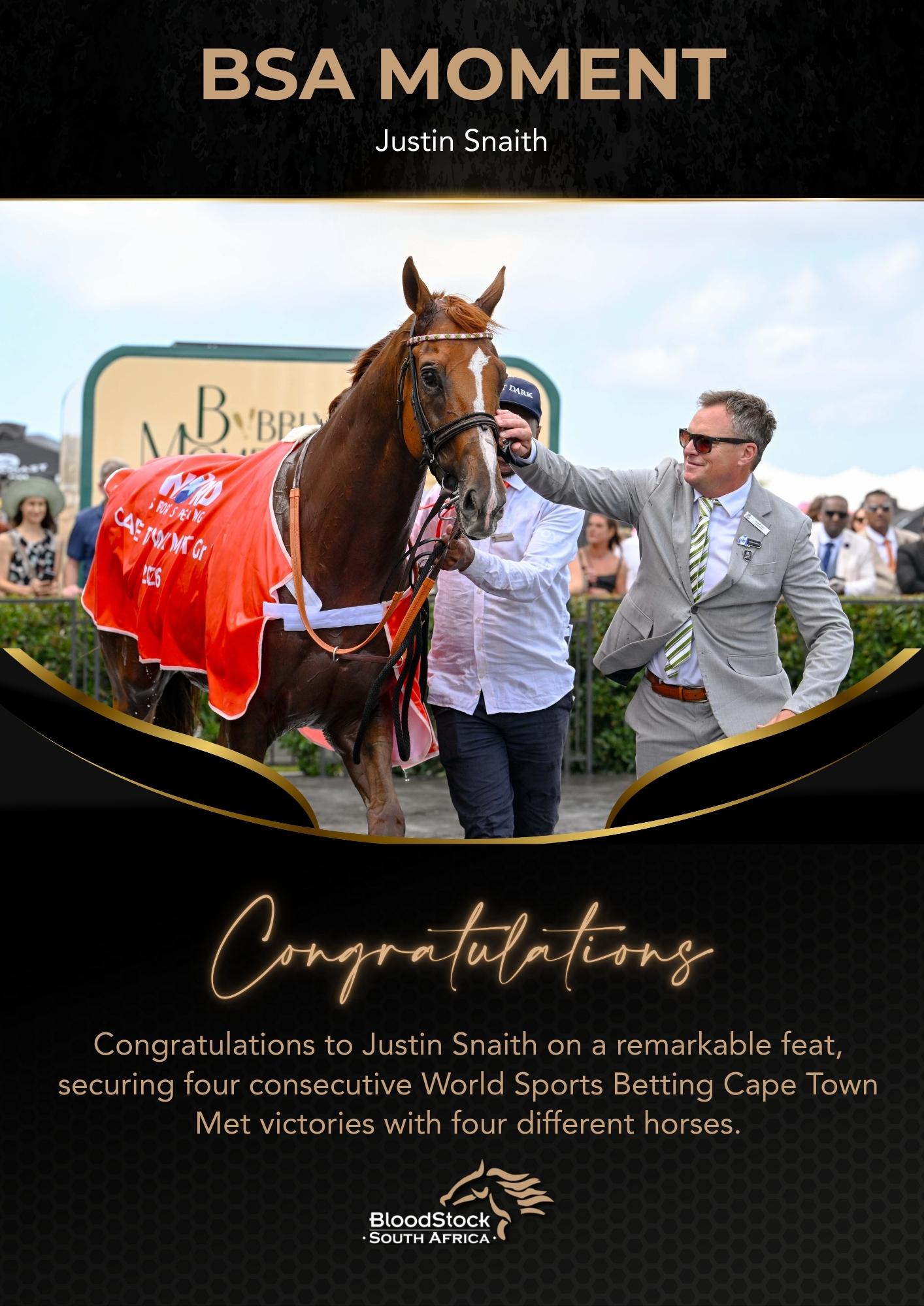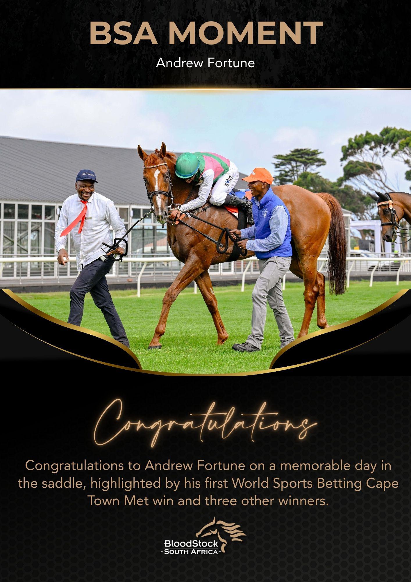 In a fairytale moment scripted in the stars, the 58-year-old Andrew Fortune registered a milestone career first R5 million World Sports Betting Gr1 Cape Town Met success when the athletic chestnut See It Again flashed through late to give trainer Justin Snaith and owner Nic Jonsson an extraordinary fourth consecutive winner in the Race Coast showcase event at Hollywoodbets Kenilworth on Saturday.