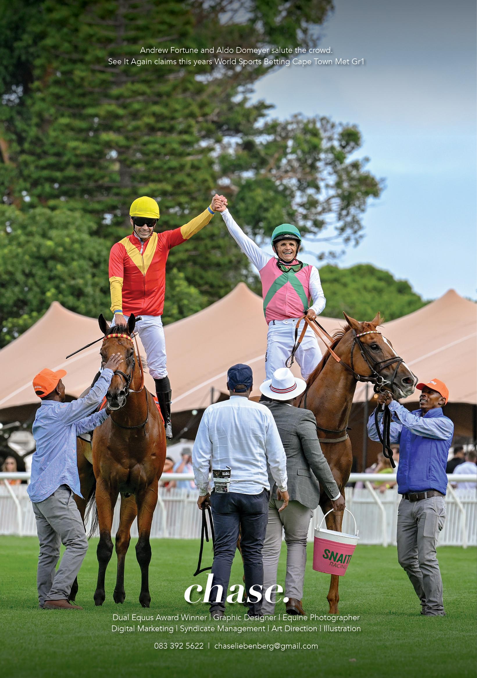 also occupied the top two places in the Maine Chance Farms Gr1 Majorca Stakes run a half hour earlier. Riding his fourth winner on the big afternoon, the crowd and television viewers were entertained by the charismatic Andrew Fortune, who forged a relationship with See It Again when the chestnut transferred to Futura Park from Michael Roberts in KZN in October last year, after developing behavioural issues.