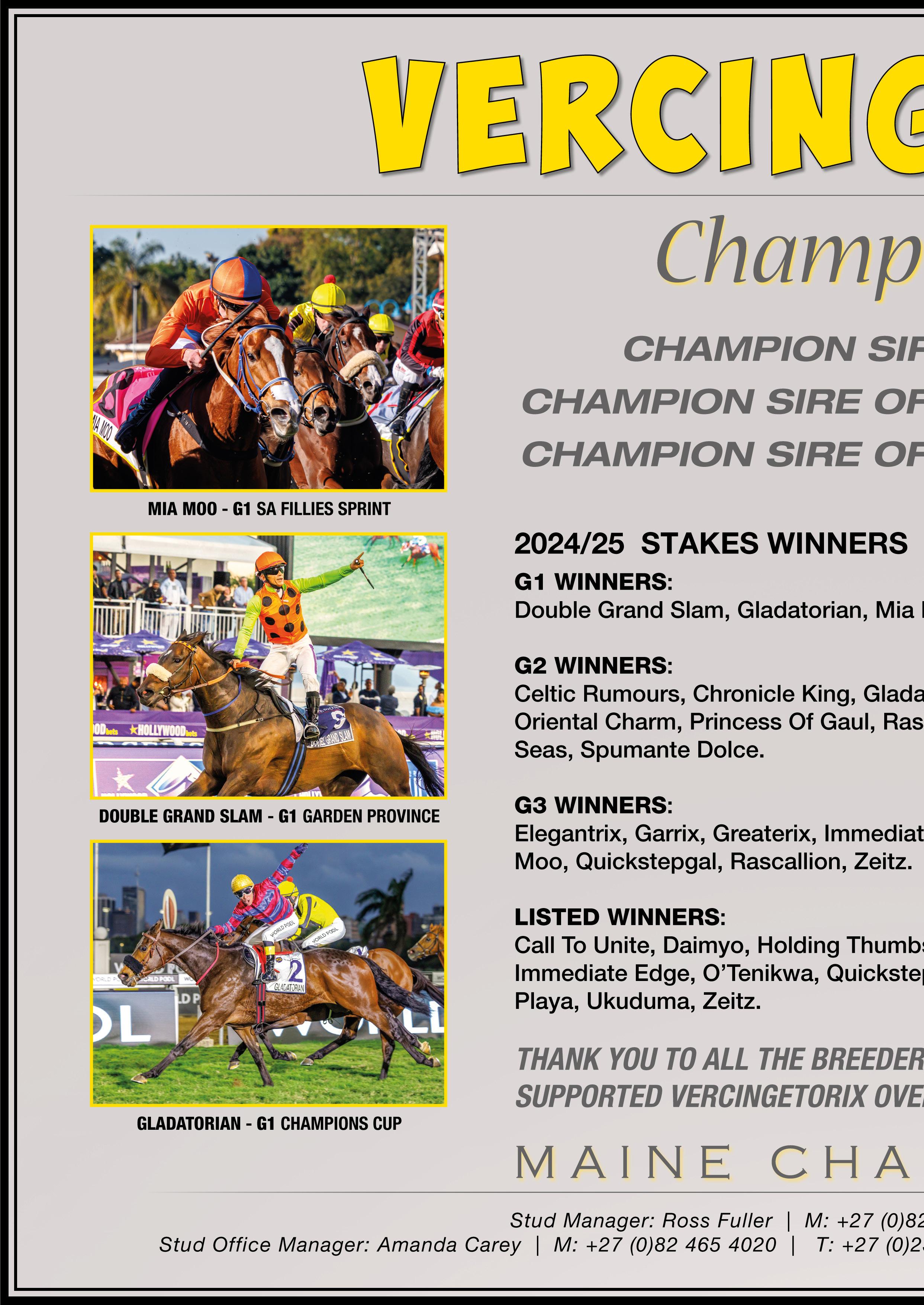 Among the notable performers produced by daughters of Casey Tibbs are dual Gr1 Durban July winner Do It Again (Twice Over), and the latter’s Hong Kong Gr3 winning half-brother Horse Of Fortune (Stronghold), Gr1 WSB SA Classic winner Red Saxon (Red Ray), and Gr1 Woolavington 2000 winner Do You Remember. The latter, like Vercingetorix, was sired by Silvano.