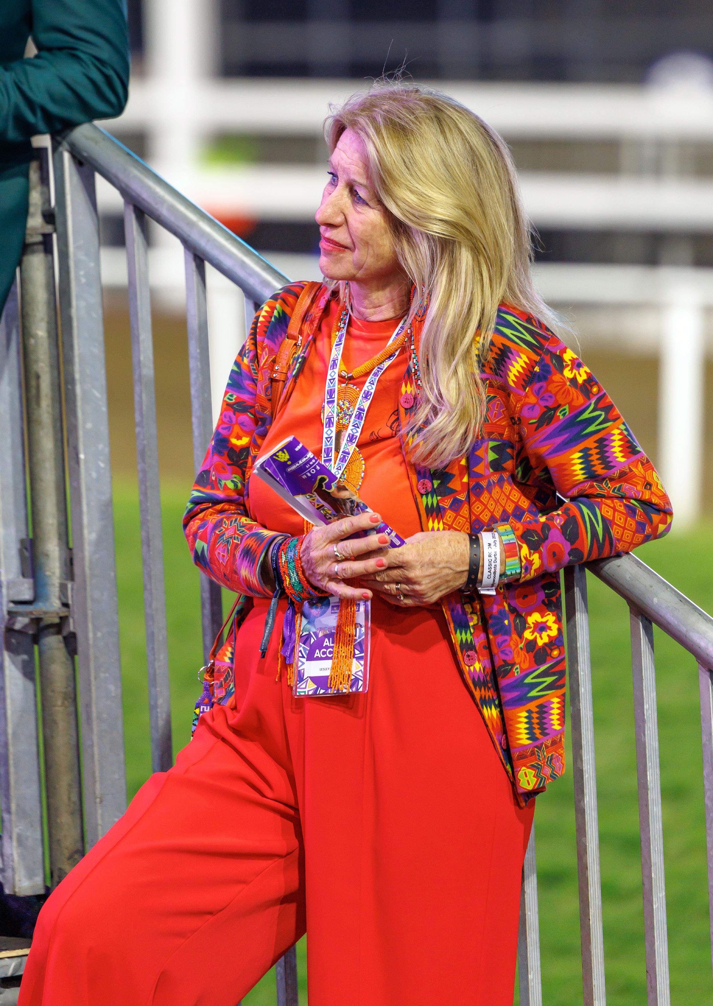 Lady in red! Lesley Heffer marvels at the Mzanzi magic | Credit: Candiese Lenferna
