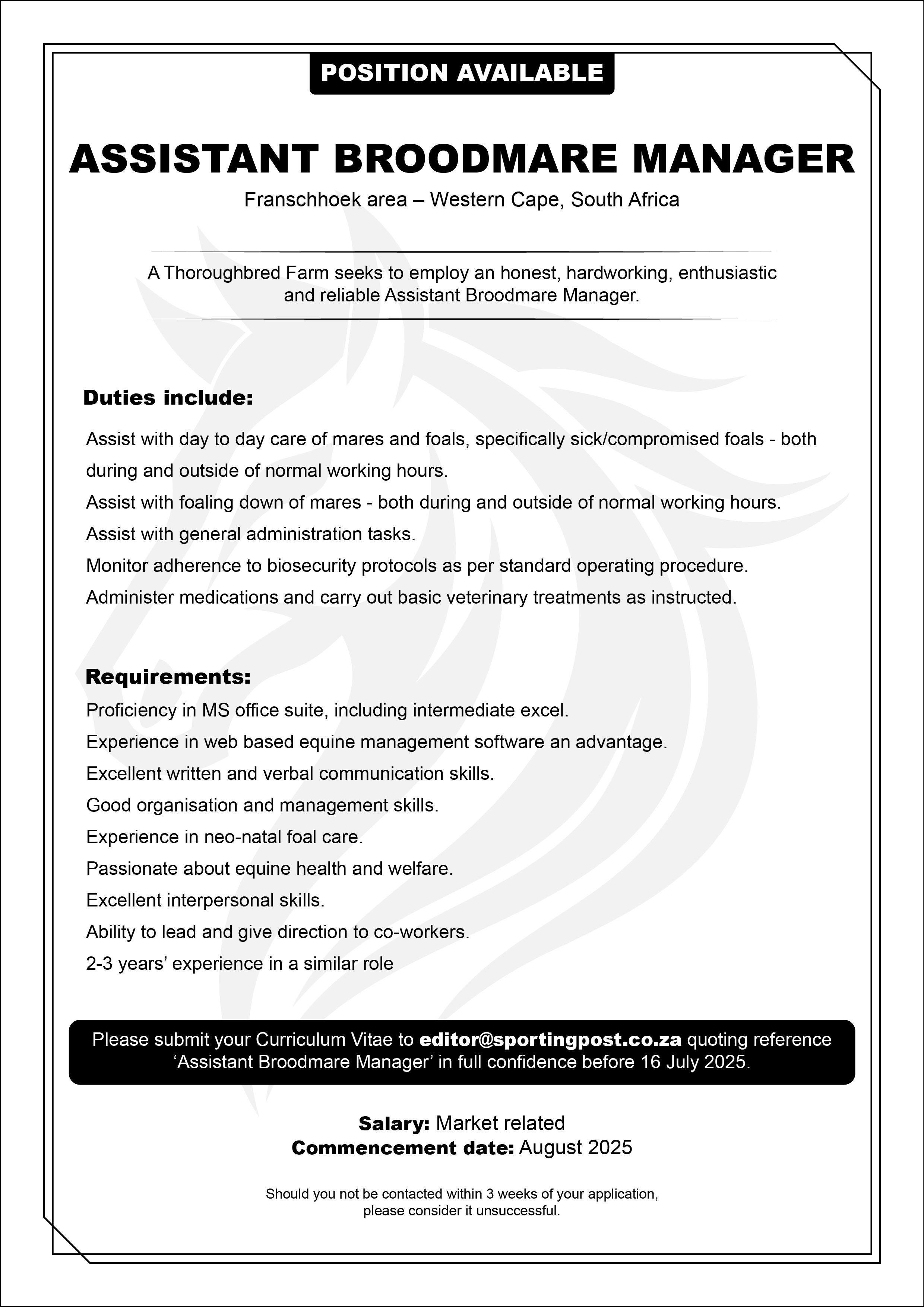 “Casey Botha is also a Zimbabwean who grew up showjumping. Ironically my loyal patron, Gerald Sadleir, secured her first job without her having ever met me or been involved in racing. She spent some time in Ireland working for a very successful bloodstock agent, Joe Foley at his stud farm Ballyhane, in Leighlinbridge Co.Carlow. She then went on to work as a student at Drakenstein Stud for over a year or so before taking up the role as a pre-training manager at Paarl Diamant. She joined my