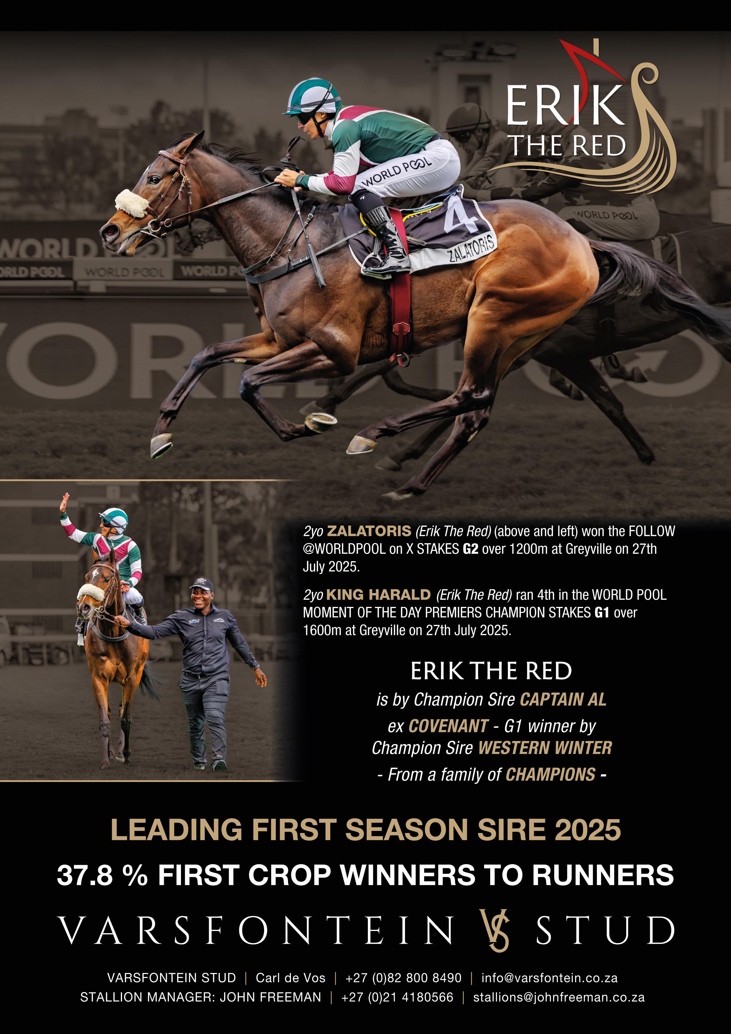 (28-10) followed up on her recent maiden victory as she upstaged the luckless 7-10 favourite Wish List, who arrived a stride late in the sixth, a Class 4 (F&M) over 1400m. The winner is a Wilgerbosdrift & Mauritzfontein bred daughter of new SA Champion sire, Vercingetorix (Silvano).