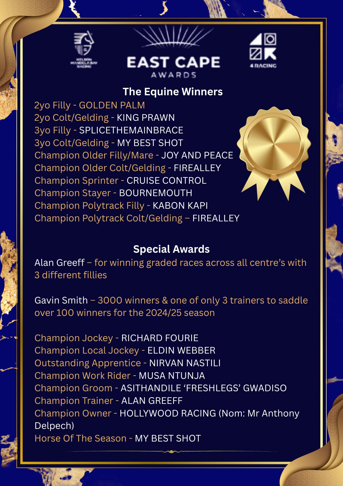 Multiple East Cape Champion trainer Alan Greeff enjoyed an extraordinary 2024/25 season of feature race success across South Africa and, along with his colleague Gavin Smith, was honoured with a special award at an emotional East Cape Racing Awards held at Fairview on Saturday evening.