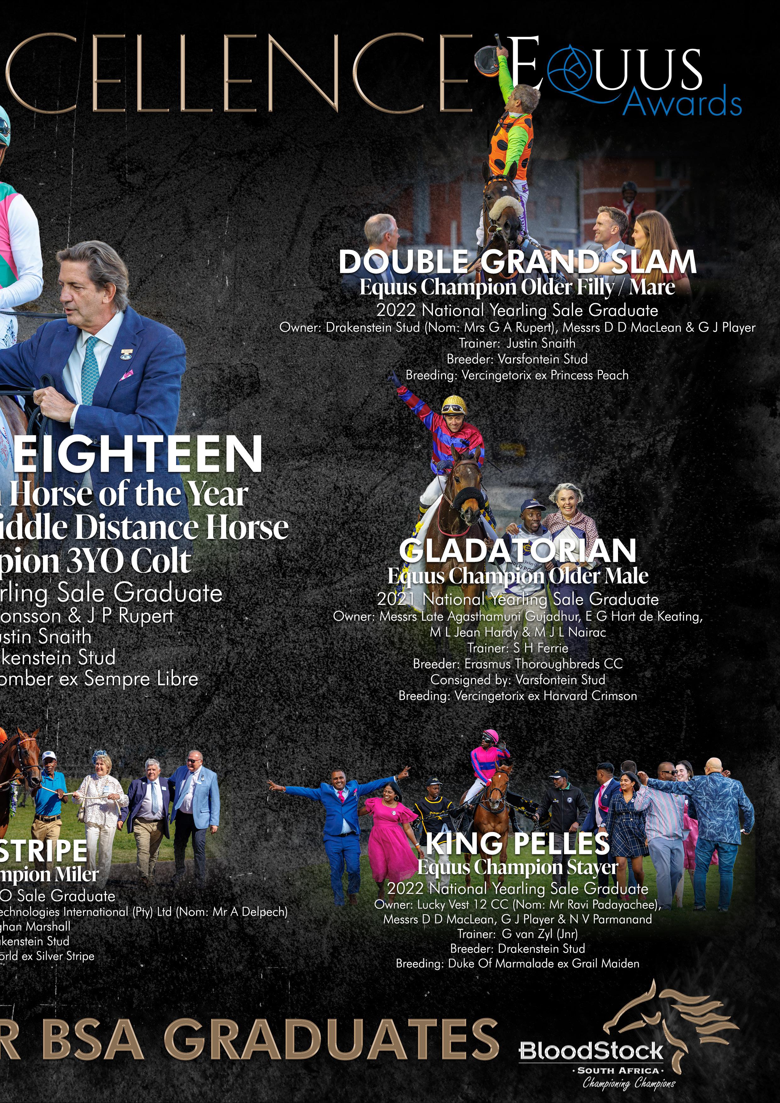 Raced by Nick Jonsson and Johann Rupert, Eight On Eighteen was also crowned Champion 3yo Male and Middle Distance Horse, and he remains an exciting prospect with the 2026 Gr1 L’Ormarins King’s Plate and Gr1 Cape Town Met his targets, with an overseas campaign a possibility thereafter.
