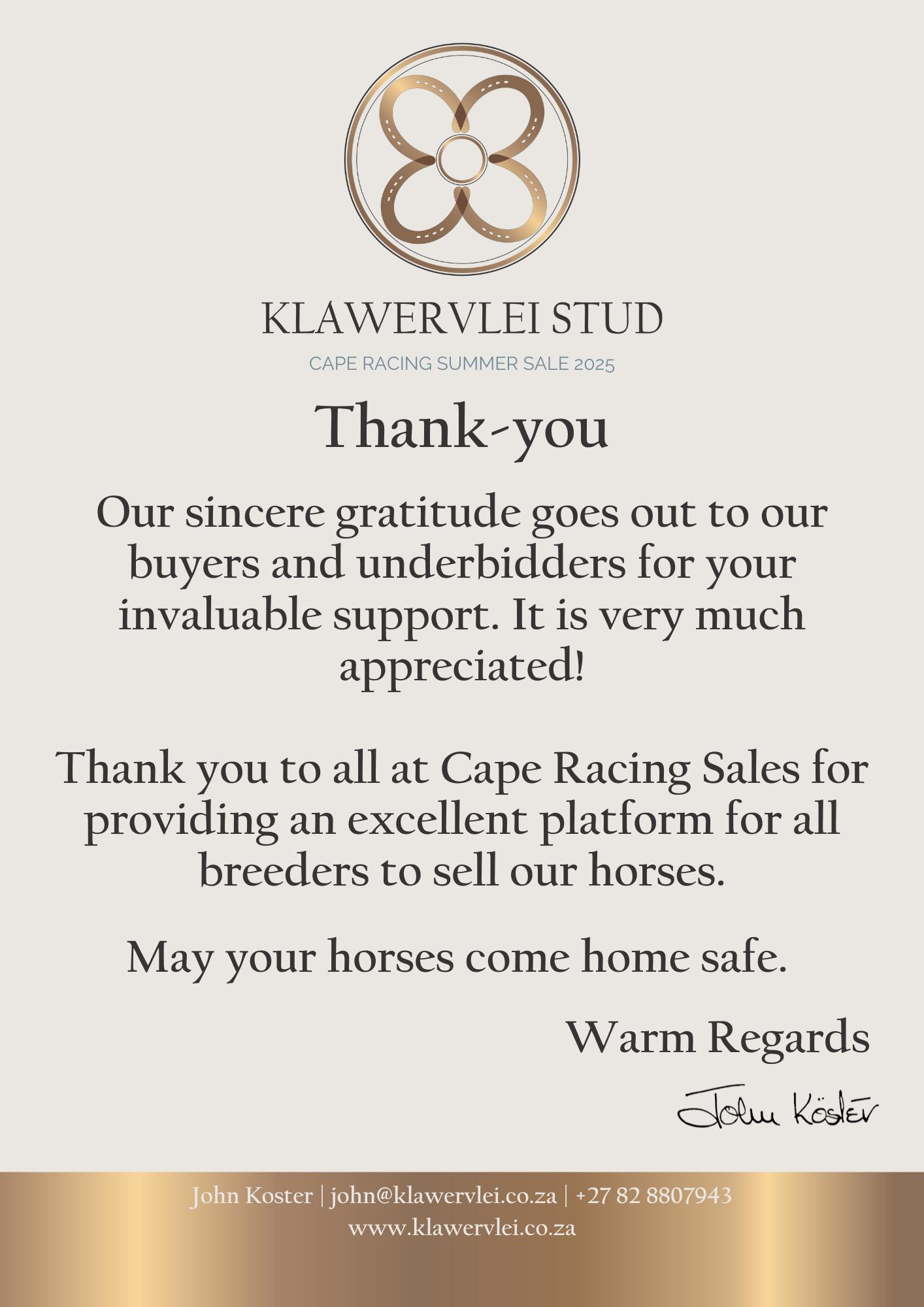 Hawwaam has a single lot on offer at the Cape Yearling Sale - a filly (Lot 53) whose twice-winning dam is a 3/4 sister to the stakes winning dam of Gr1 Ridgemont Garden Province Stakes winner Humdinger.