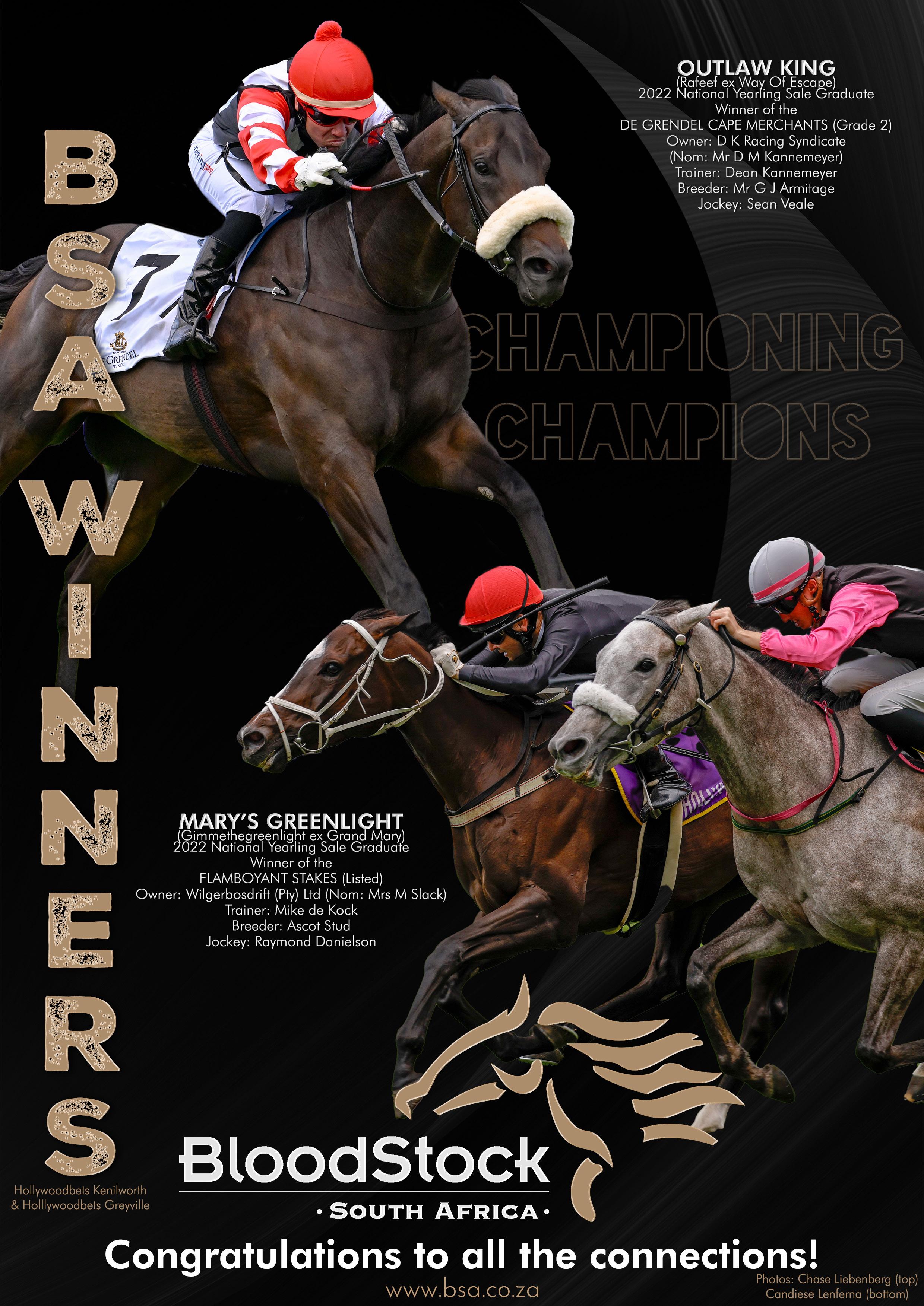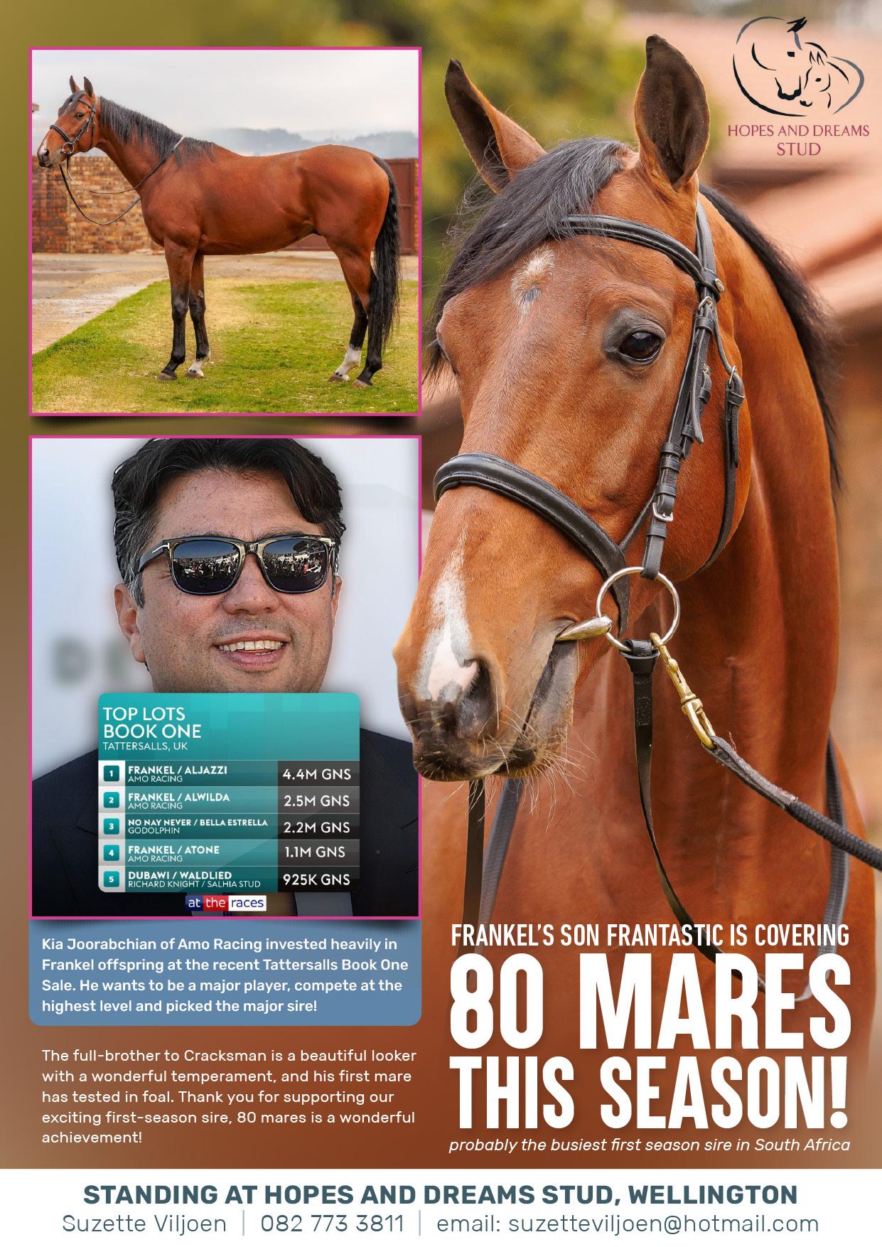 Her total stakes earned for the past season amounted to R14,5 million. Her four Grade 1 winners included the brilliant Charles Dickens, now at Drakenstein Stud, and the superstar filly Beach Bomb, exported and racing in the United States.