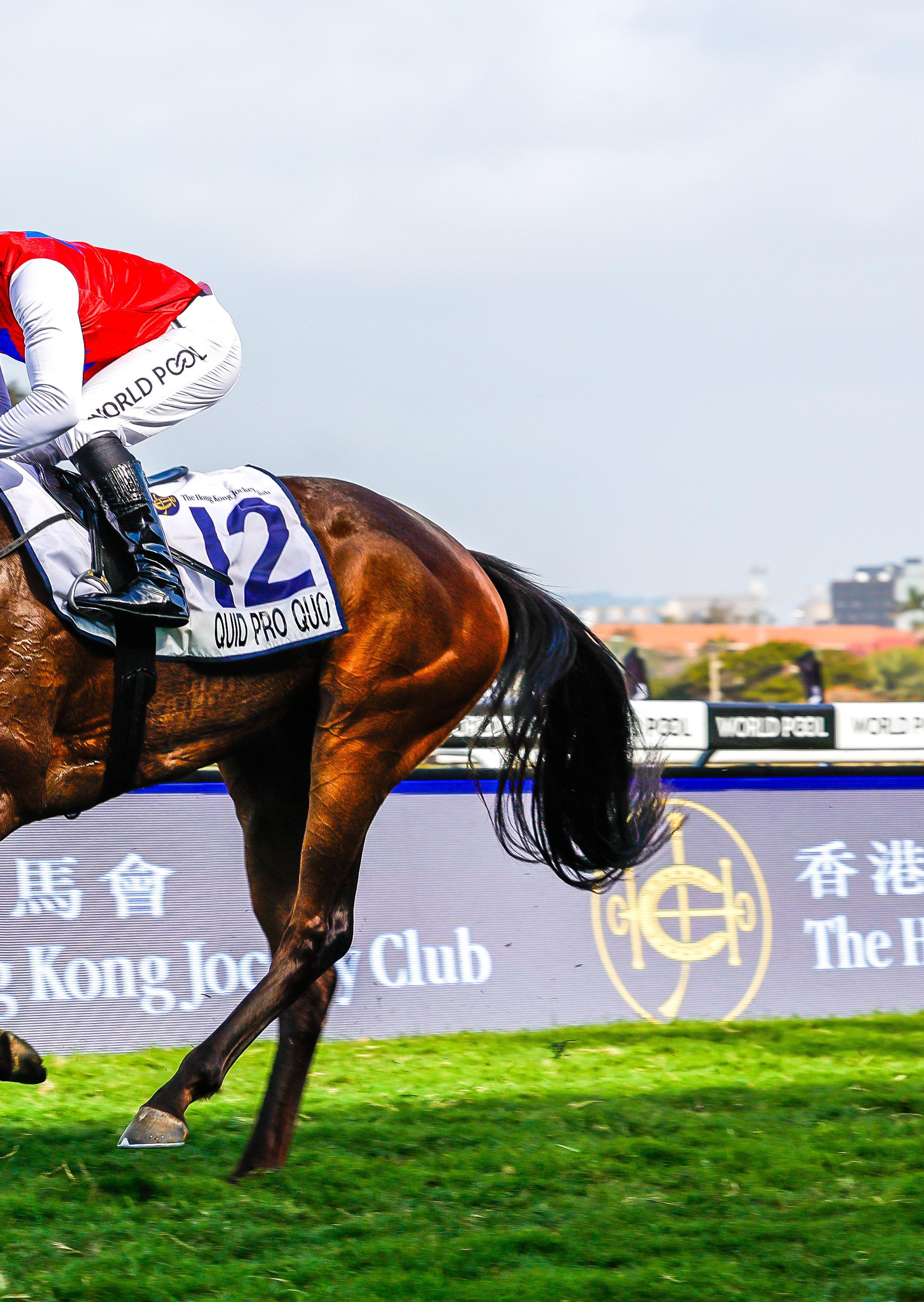 Winner of the 2022 Gr1 Gran Premio Carlos Pellegrini (2400m) in Argentina, Bravehearts (118lb) was ridden patiently by Matthew Poon before emerging at the top of the straight to down Winning Dragon (124lb) by a length, with another length to three-year-old Romantic Thor (124) who showcased his BMW Hong Kong Derby (2000m) credentials with a brave third.
