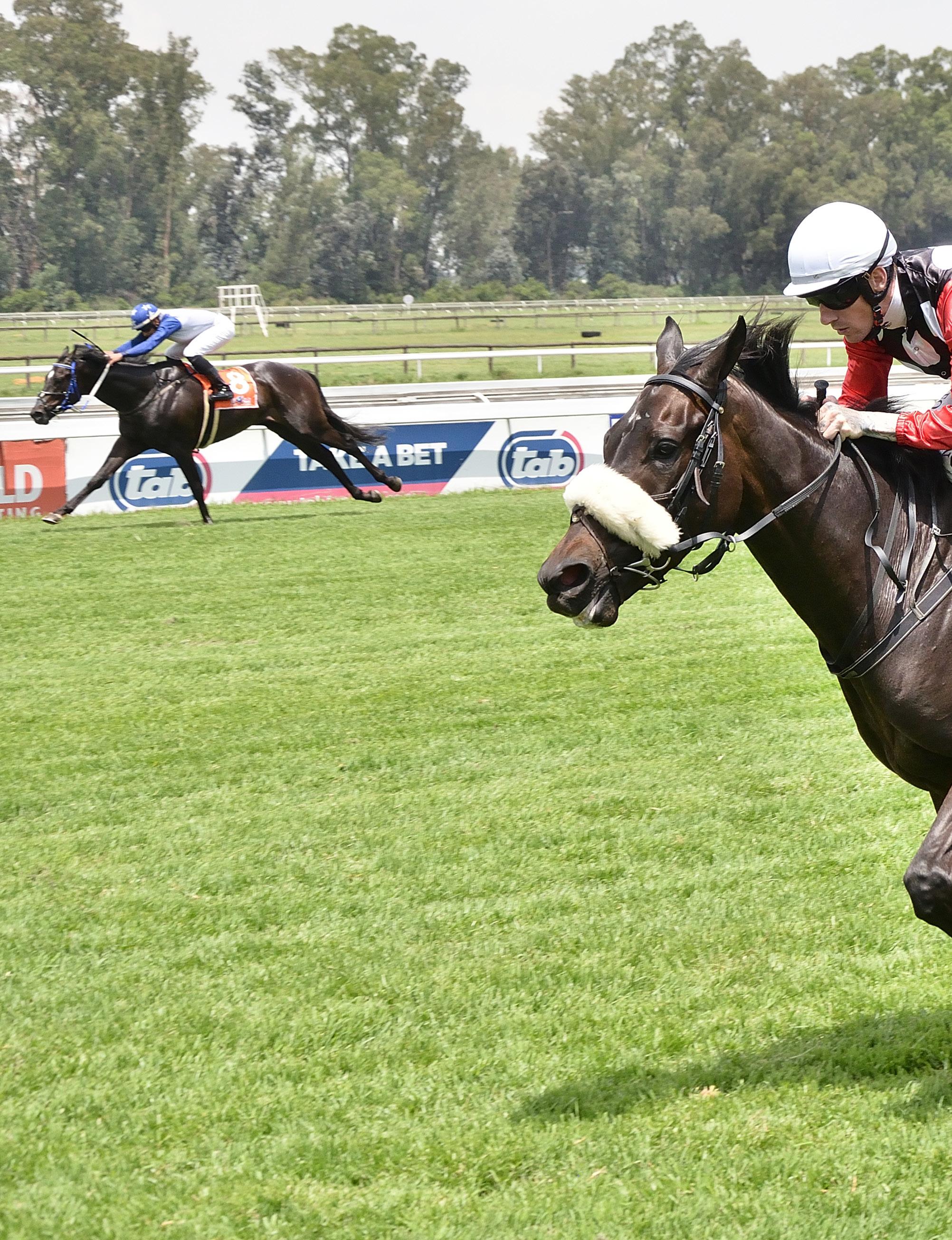 Craig Zackey drives Tsunami Warning up the inside as Sean Veale has Trippi’s Silk challenging hard | Credit: Chase Liebenberg